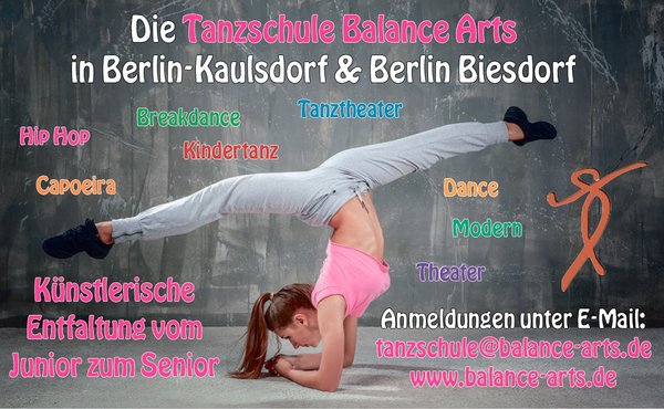 Unser kreatives Angebot ist ganz der künstlerischen Entfaltung und dem Erlernen gesunder Bewegung vom Kind bis zum Erwachsenen, für den absoluten Einsteiger bis zu fortgeschritten Tänzern gewidmet. Kreativer Kindertanz, Ballett, Breakdance, Tanztheater, Urban Dance, HipHop, Zeitgenössischer Tanz (Contemporary Dance), Modern Dance, Paartanz, Hochzeitstanz, Seniorentanz und Fitness. Wir bieten außerdem Gesellschaftstanz & Zeitgenössischen Tanz für Schulklassen an und Privatstunden für ganz spezielle Choreographien oder Trainingseinheiten.
