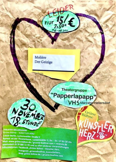 In unserem Theaterstück „Der Geizige“ von Molière zeigen das Theater Ensemble der Volkshochschule Marzahn-Hellersdorf unter der Leitung von Maike Bartz wie man mit Geld umgeht – oder besser gesagt, wie man es nicht tun sollte! Harpagon, der Meister des Sparens, wird euch auf eine turbulente Reise voller Missverständnisse, Witz und unerwarteter Wendungen entführen. Ob er am Ende wirklich sein Glück findet – oder nur sein Geld – bleibt abzuwarten.