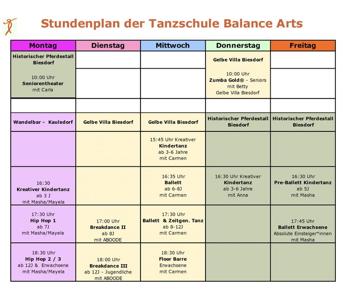 Unser kreatives Angebot ist ganz der künstlerischen Entfaltung und dem Erlernen gesunder Bewegung vom Kind bis zum Erwachsenen, für den absoluten Einsteiger bis zu fortgeschritten Tänzern gewidmet. Kreativer Kindertanz, Ballett, Breakdance, Tanztheater, Urban Dance, HipHop, Zeitgenössischer Tanz (Contemporary Dance), Modern Dance, Paartanz, Hochzeitstanz, Seniorentanz und Fitness. Wir bieten außerdem Gesellschaftstanz & Zeitgenössischen Tanz für Schulklassen an und Privatstunden für ganz spezielle Choreographien oder Trainingseinheiten.